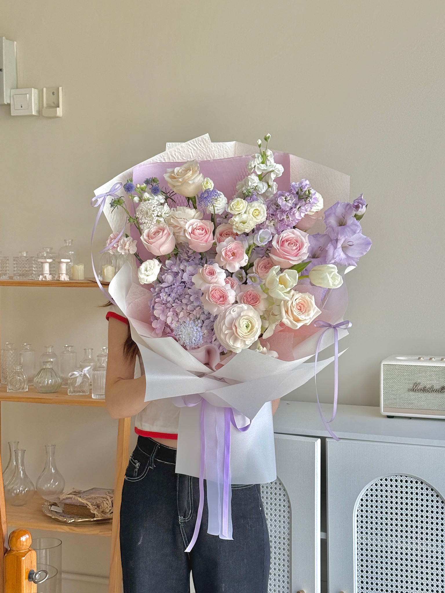 Feature flower: Roses, eustoma, spray rose, hydrangea (FOR M+ size & above) & other filler flowers